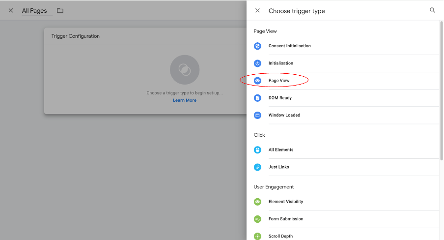 Step 8: Under “Choose trigger type” select “Page View”.