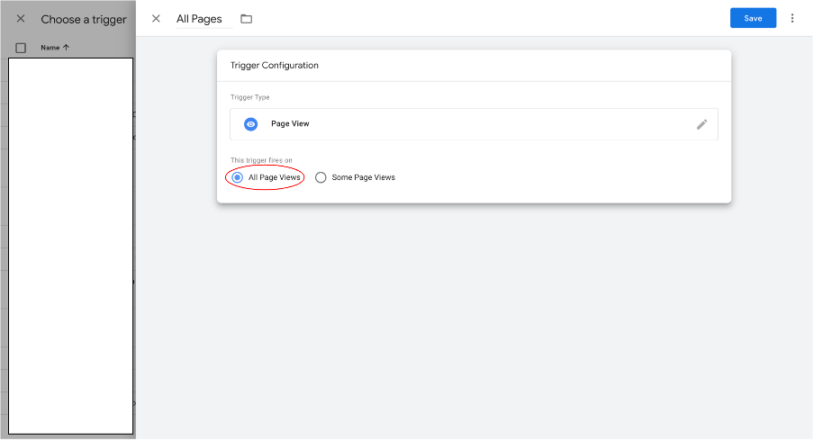 Step 9: Select “All Page Views” as we want our configuration tag to fire on every page users visit after clicking on our ad, then click “Save”.