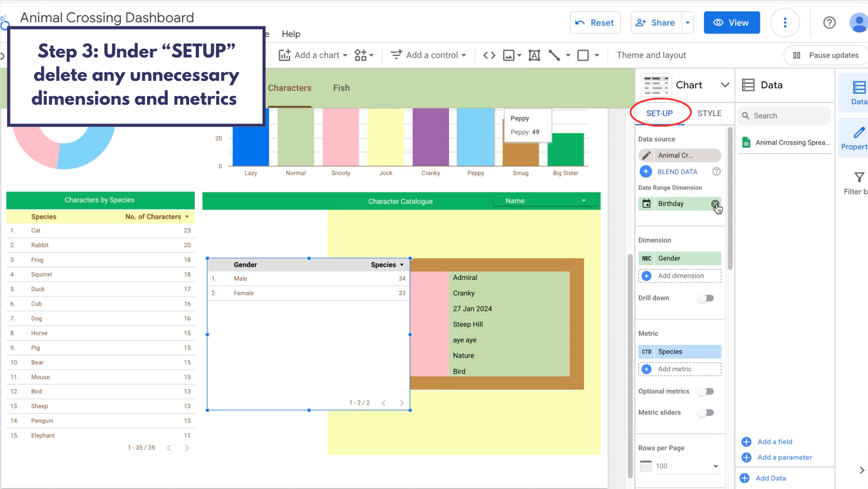 - In the chart settings tab under “SET-UP” delete any unnecessary dimensions and metrics.
