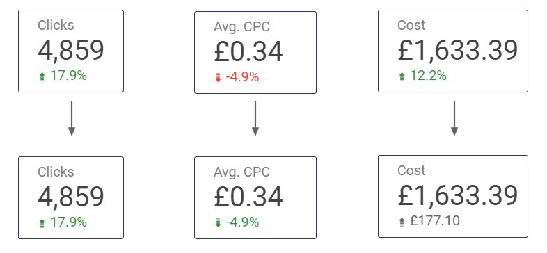 Let’s look at an example of three frequently used metrics for PPC Campaigns: Number of Clicks, Average Cost-Per-Click, and Total Cost. Here we have three distinct metrics, in which the nature of comparisons varies. For Clicks, it is a positive to see an increase in this number. However, for Avg. CPC, ideally we would like to see this value reduced.