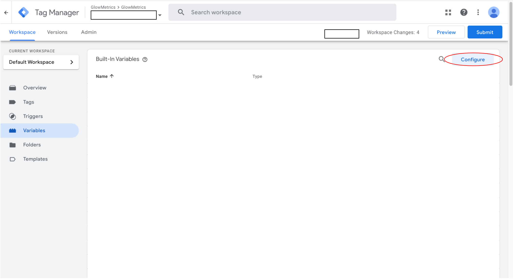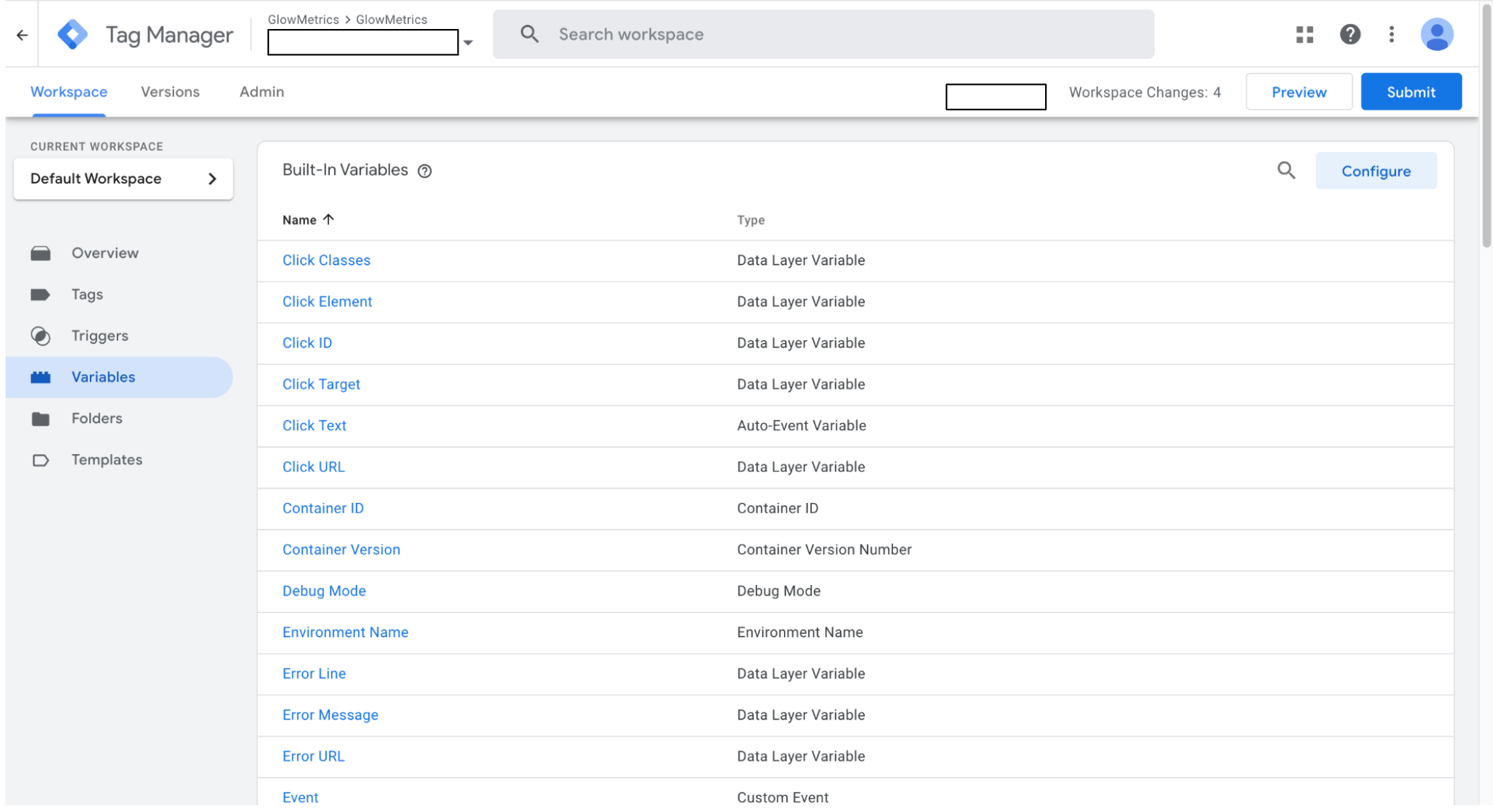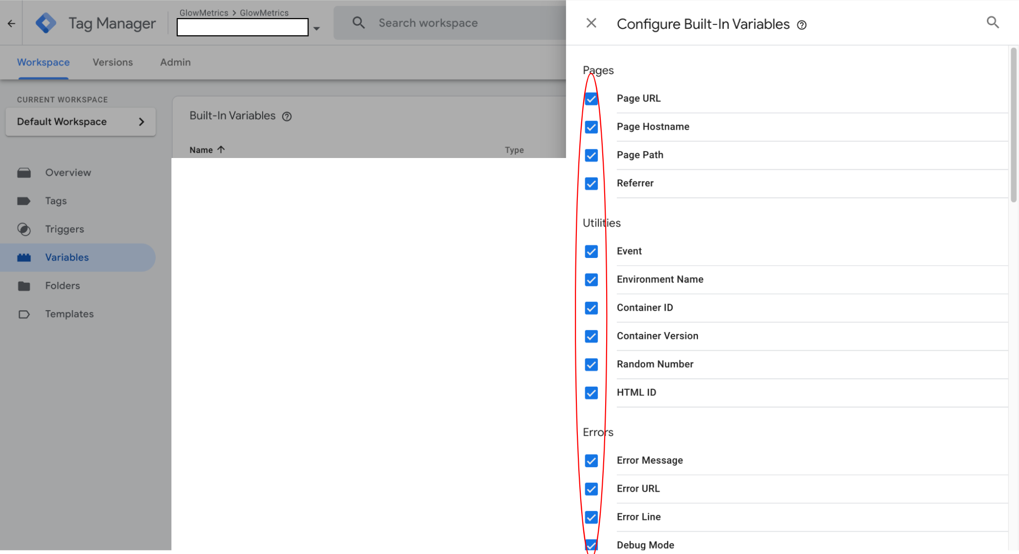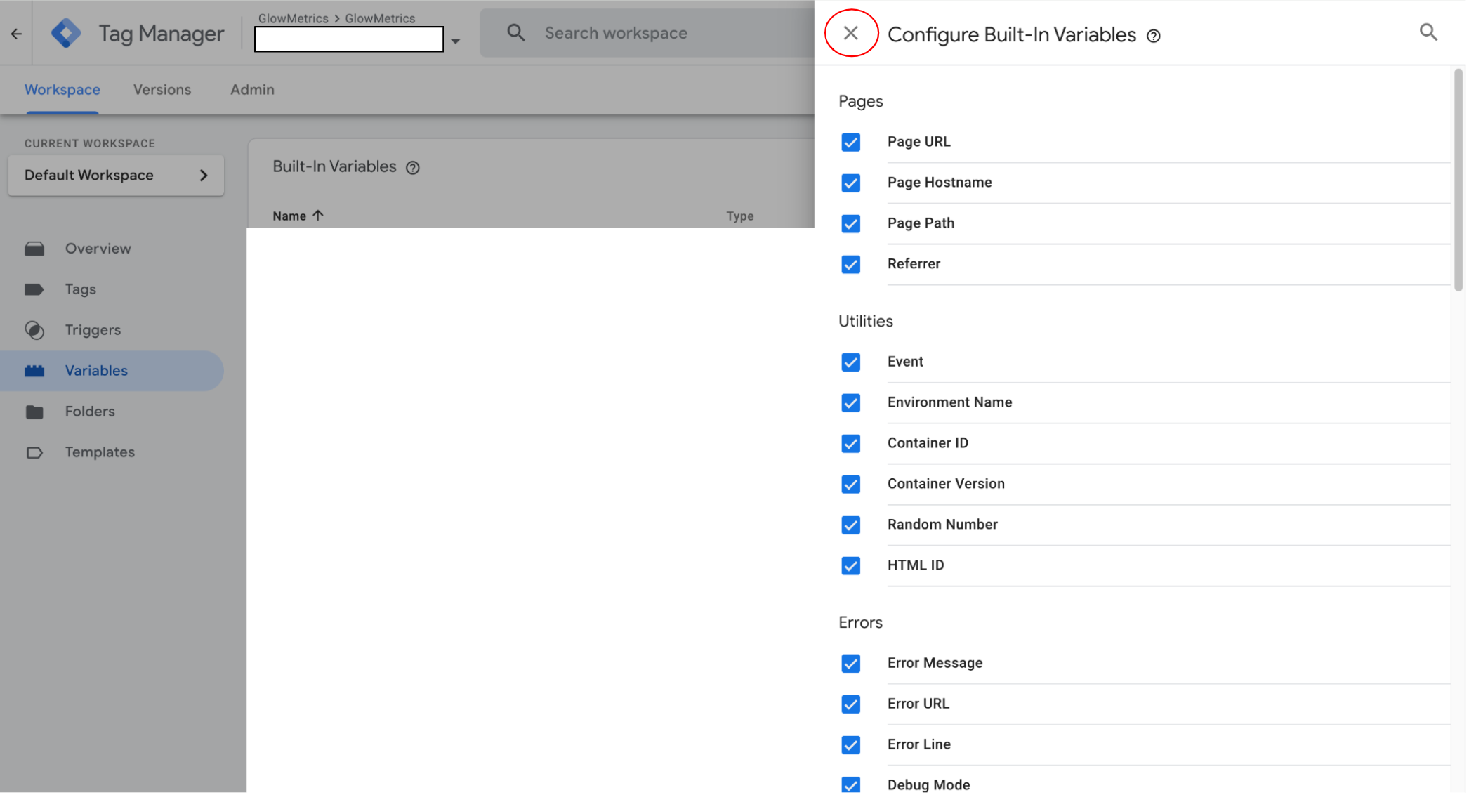 - Once you have selected all your desired variables, click “X” – these have now been configured and will appear in the “Built-In Variables” section as shown below.
