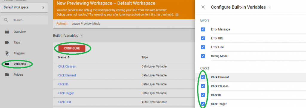 2) When you’re just getting started, remember to go in and enable all the variables you need by ticking all of the relevant selections. Otherwise, you won’t have access to ‘Click Text’, ‘Click URL’ and so on from the variable selection menus (and won’t be able to do much!).