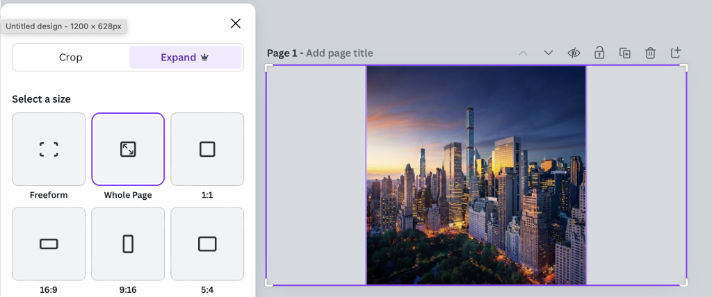 Canva has a solution for this! Canva Premium’s expand tool which can be found under the ‘crop’ function can be used to quickly and easily resize images to fit specific dimensions. This tool offers several key benefits:
