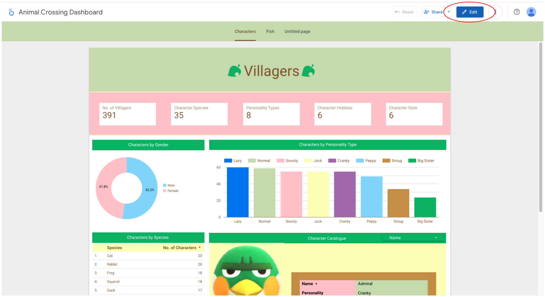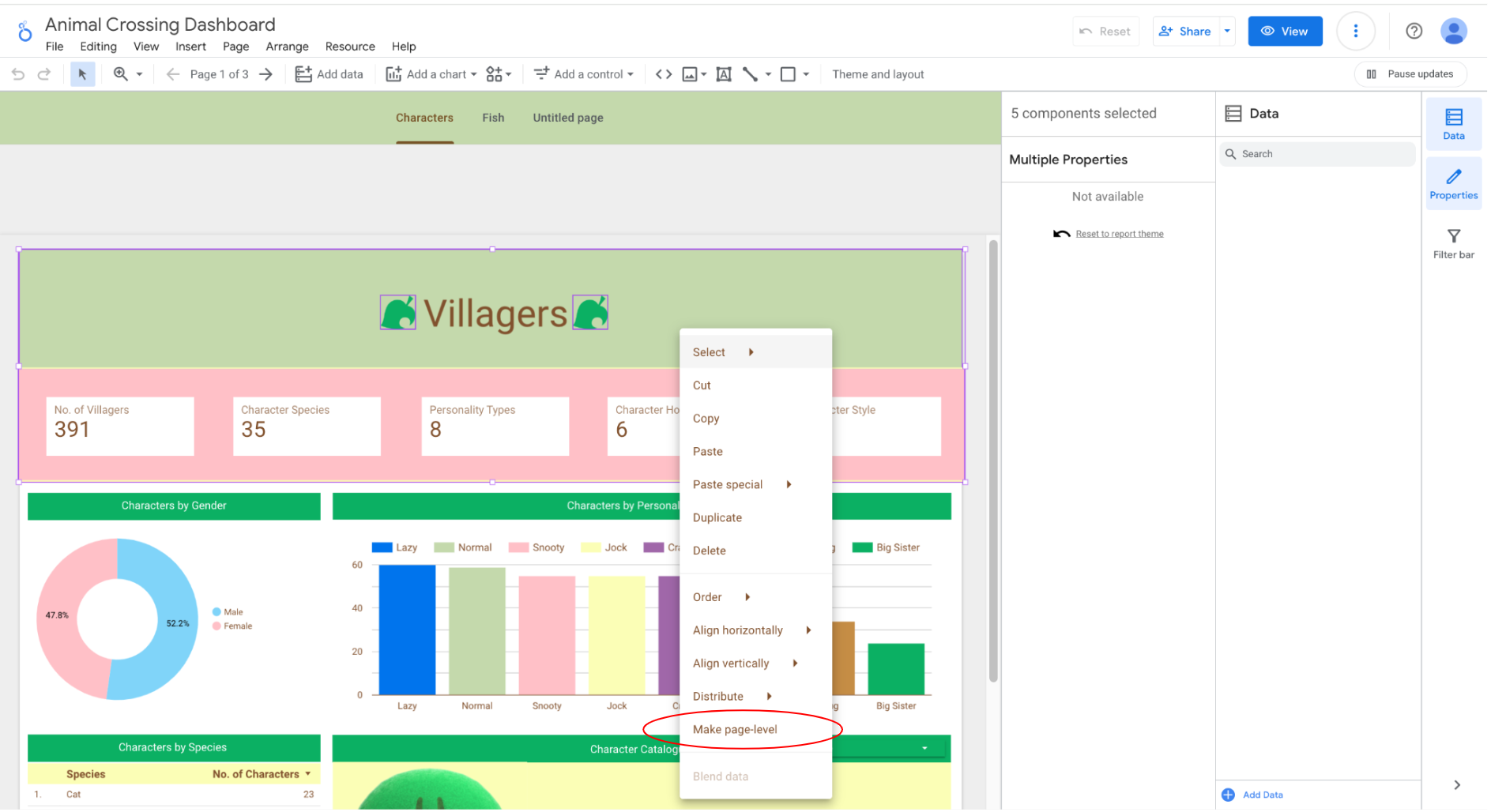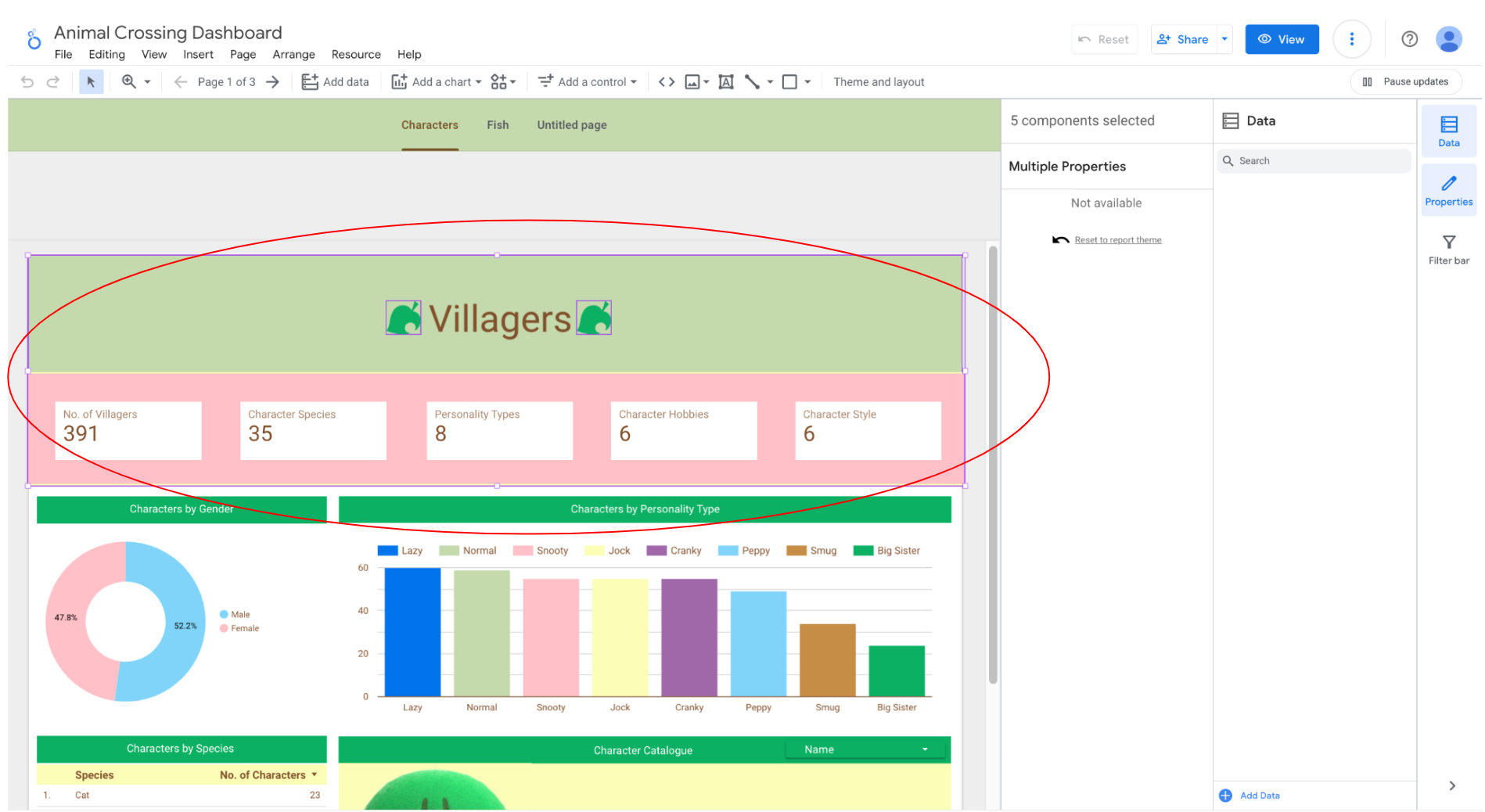 Here we’re going to use a report header as an example but these steps can be applied to any element! (and yes… that is an Animal Crossing dashboard).