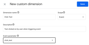 The ‘event_parameter’ here should match EXACTLY what you’ve used in your GTM tag configuration (refer back to earlier screenshot). The ‘Dimension Name’ is how it will look in the GA4 interface so you can name that as you wish and the Description is purely for anyone looking at the account configuration so they know what it’s used for. In this instance, we should also use ‘Event scope’ as we only want to associate this parameter value with this singular event hit.